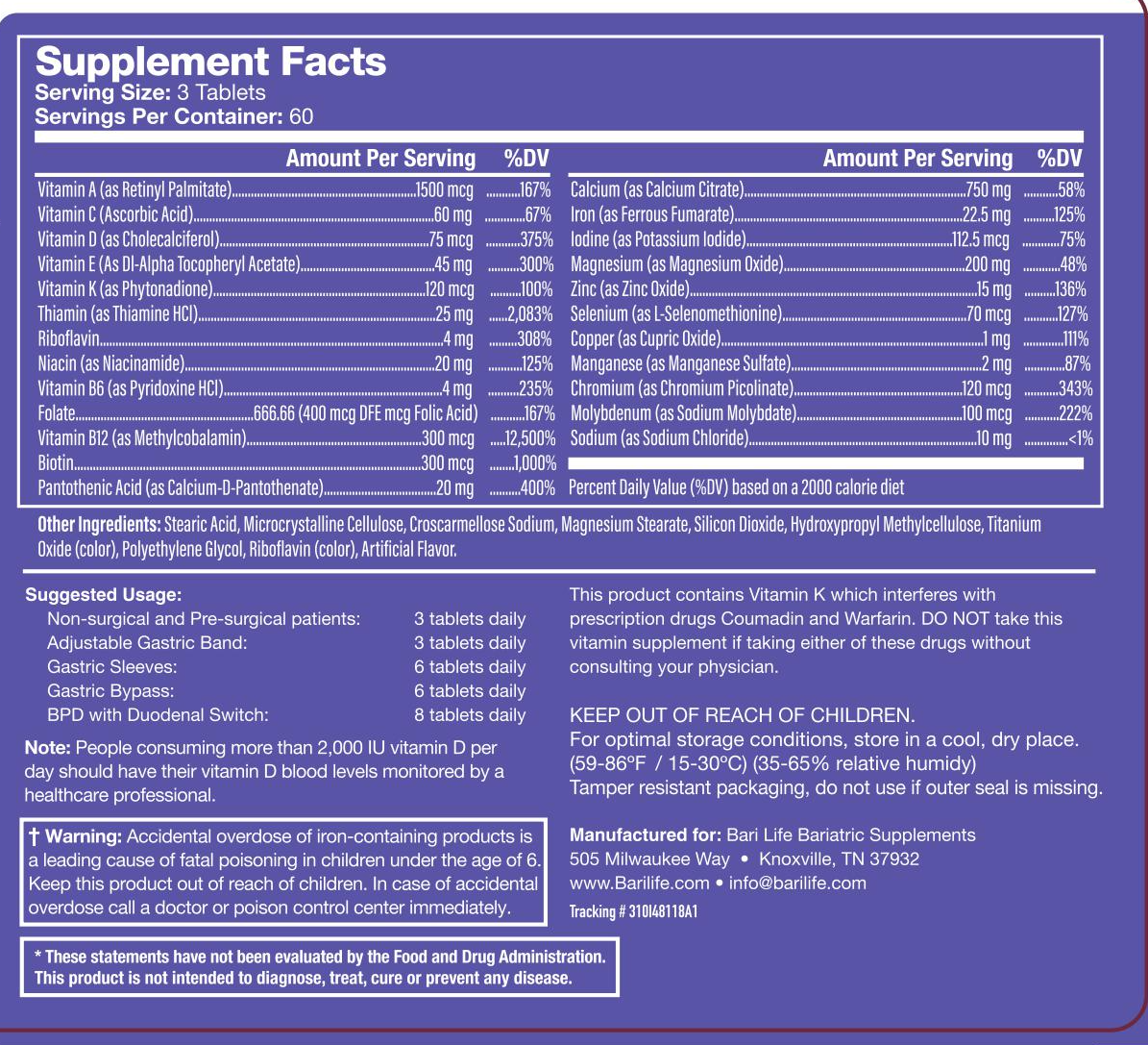 Simplify your vitamin regimen today with Bari Life Multivitamin Tablets. They are designed for all bariatric surgery patients. The tablets have a nice vanilla scent and a hydrophilic coating that makes them very easy-to-swallow. The dosage depends on the type of bariatric surgery. (See Recommended Dosage under Directions below).