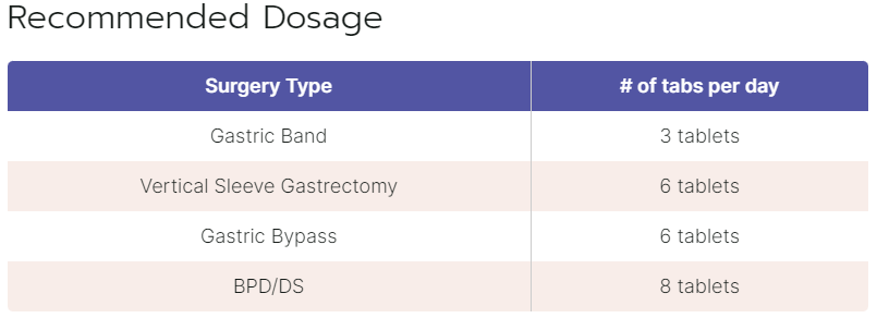 - Gastric Bypass: 6 tablets/daily (3 in the morning & 3 in the evening OR 2 in the morning, 2 around lunchtime & 2 in the evening)